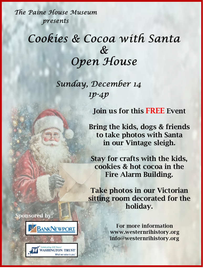Come take your holiday photos with Santa in our vintage sleigh. Crafts & cocoa for the kids in the Fire Alarm Building.