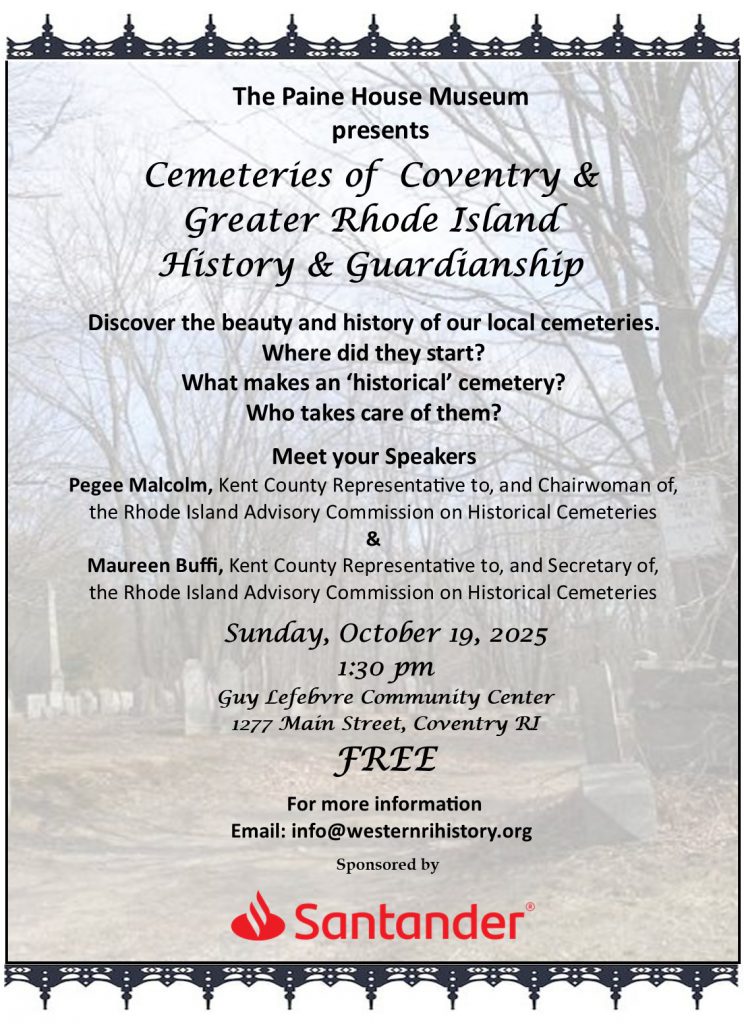 Programs & Presentations Cemeteries of Coventry & Greater Rhode Island FREE but please register via Facebook Event or by emailing info@westernrihistory.org